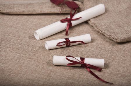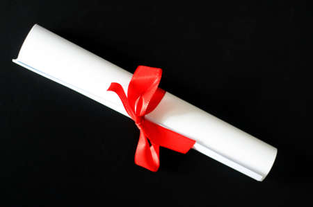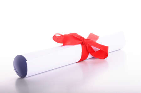 Scroll sheet in roll and ribbon with bow. Red diploma is a document of a graduate student, a certificate of graduation from a University, College and obtaining the title, academic degree.