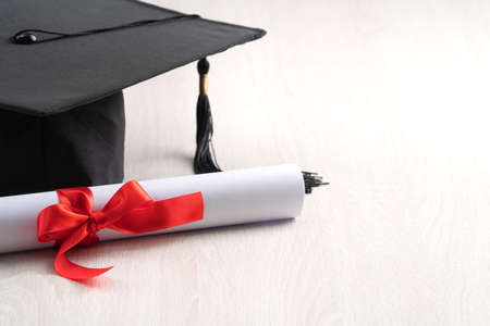 Close up of graduation square academic cap with degree diploma on wooden table background.