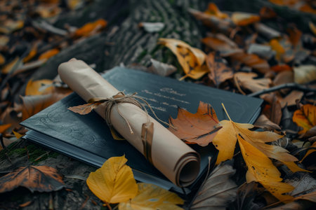Old book and paper scroll tied with rope lying on the ground covered with colorful autumn leaves