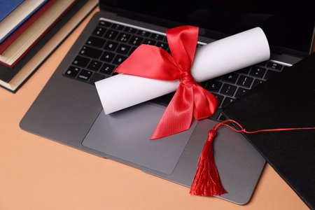 A black graduation cap sits atop a stack of three books. Next to the books, a diploma scroll tied with an orange ribbon rests on the keyboard of a silver laptop.