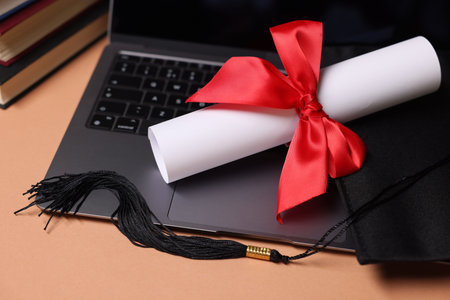 Graduation cap, diploma, laptop and books on beige table, closeup