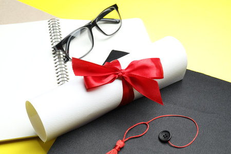 Diploma, graduation hat, glasses and notebook on yellow background, closeup