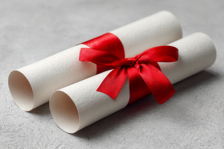 Elegant scrolls of achievement, delicately wrapped in vibrant crimson ribbons, lie quietly on a rugged gray backdrop, evoking pride and joyful achievement.