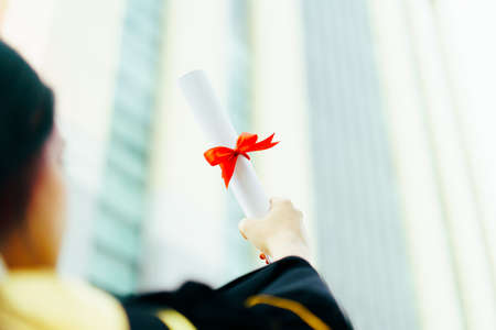 Happy Asian graduate student holding the diplomas on hand during the university graduation ceremony. Master degree student in gown suit holding a diplomas for photography.