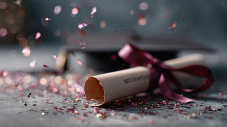 Close-up of a graduation cap with a rolled diploma, surrounded by confetti, symbolizing achievement and success