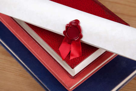 Diploma with red ribbon on a book. Education concept. Selective focus.