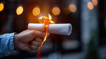 A close-up of a hand holding a scroll tied with an orange ribbon, symbolizing graduation or achievement, set against a softly blurred background of evening lights.