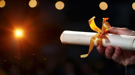 A hand presents a diploma elegantly tied with a golden ribbon, set against a soft bokeh background, symbolizing achievement and celebration in education and personal milestones.