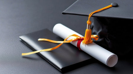 A graduation cap and diploma are displayed on a table. The cap is black and yellow, and the diploma is white. Concept of accomplishment and pride, as the cap
