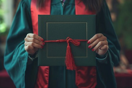 Close-up of a hand holding diploma tied with red ribbon. Graduation, awards, achievements, and celebration theme. Perfect for education, business, and success concepts.