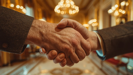 Two hands engage in a handshake within a beautifully decorated indoor space, symbolizing trust and partnership. Soft lighting illuminates the elegant surroundings, enhancing the moment.