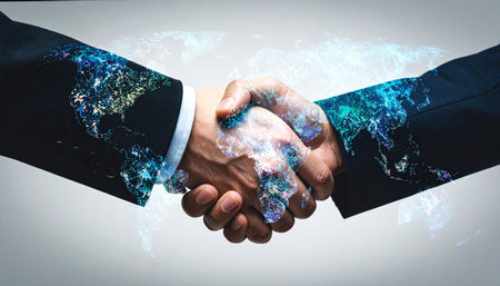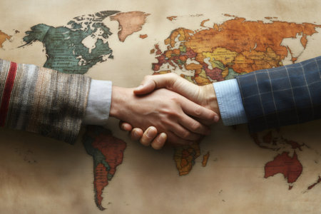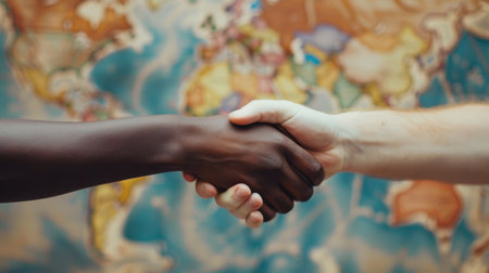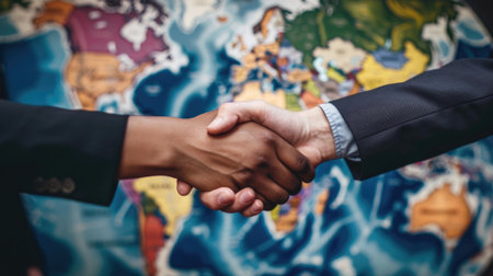 Handshake between diverse individuals against a world map backdrop, symbolizing international business.