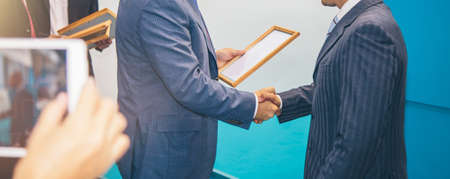 image of businessmen is shaking hands, businessman agrees to be the same cooperate in order to step through away the bad economy together.