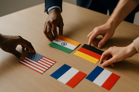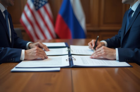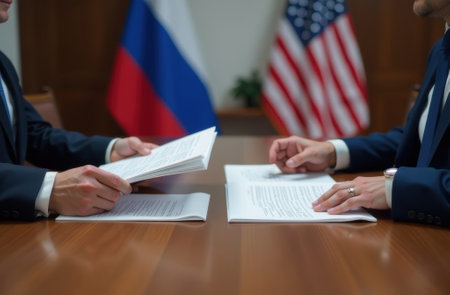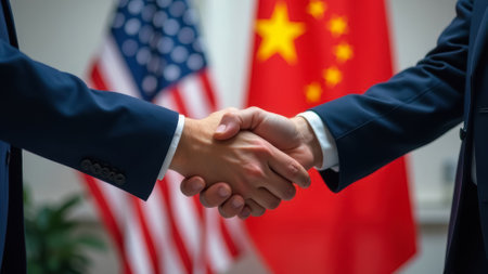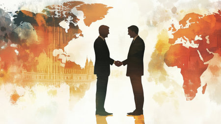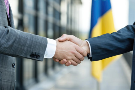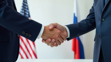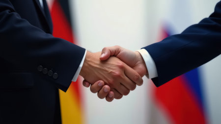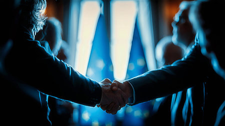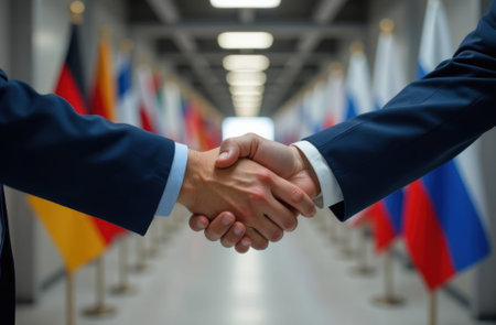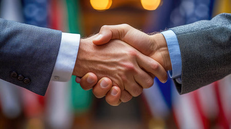 Two diplomats engage in a handshake during a formal negotiation, symbolizing agreement and cooperation in a professional setting, with flags in the background.