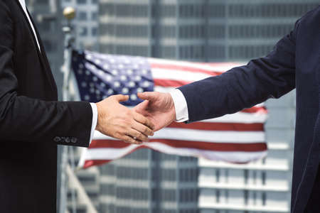 Handshake of two businessmen on the background of USA flag, partnership concept, close up
