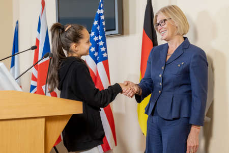 Smiling mature congresswoman in formal suit shaking hand of little activist after her presentation at political meeting