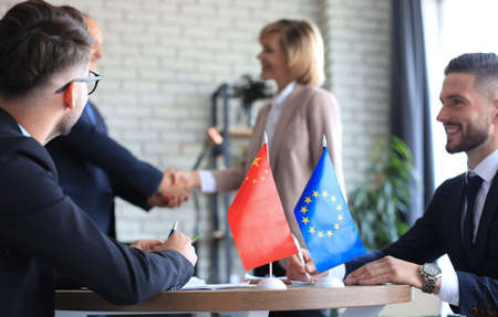 Close-up of two businessmen shaking hands in front of flags of China and USA