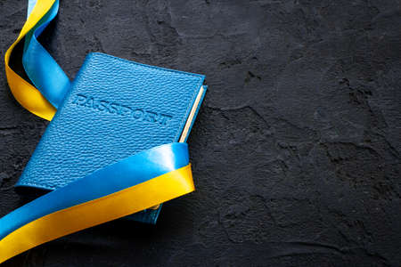 Yellow and blue ribbon with passport. Ukrainian immigration concept