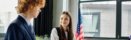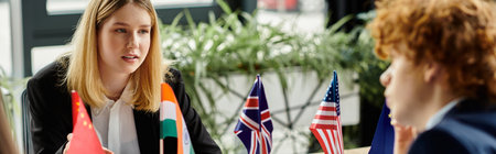 Attractive businesswoman near diplomats and flags of America Background - Ai Generated