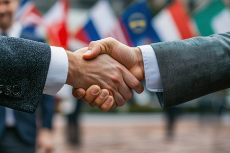 Two businessmen shaking hands outdoors, with international flags in the background. Symbol of diplomacy, agreement, and cooperation between nations.