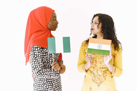 African and Asian women together on white background