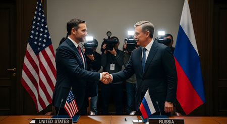 Political leaders shaking hands after a successful international negotiation, symbolizing cooperation and agreement.