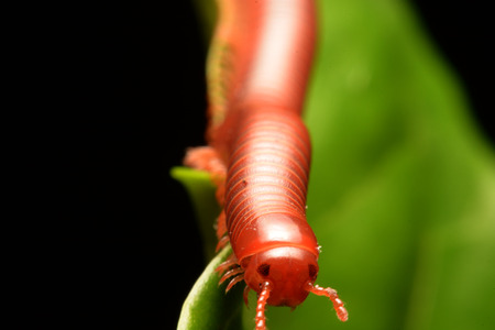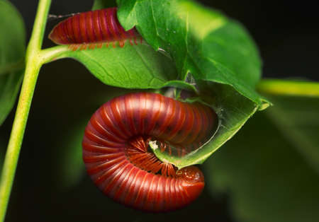 Macro of orange and brown millipede on green leaf, Millipede coiled, Disambiguation, Low key photo.