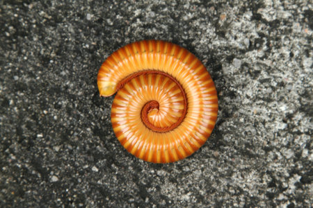 Detailed Macro photo of rolled up Millipede similar to Centipede. An organism of species Phyllogonostreptus nigrolabiatus, with bokeh effect of soil in background. Rolled up in respond to stimulus.