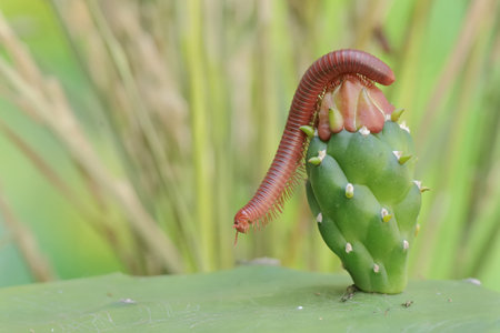 Macro of orange and brown millipede on green leaf, Millipede coiled, Disambiguation