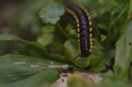 A centipede is on leaves. It is invertebrate. It is poisonous animals and have many legs.