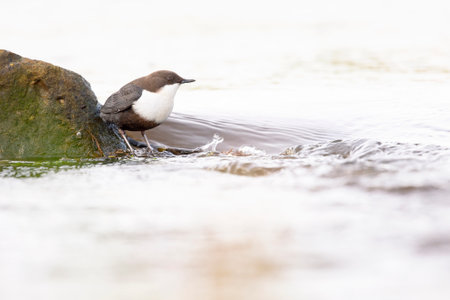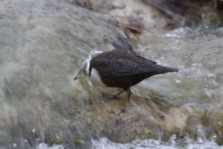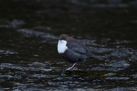 A white-throated dipper Cinclus cinclus perched in streaming water in search for food.