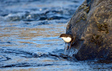 The white throated dipper Cinclus cinclus sitting on a hunts for food in the water in the river, the best photo.