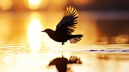 A bird in mid-flight, captured as a dark silhouette against the bright, reflective surface of water during sunset.