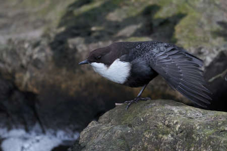 A white-throated dipper Cinclus cinclus perched and stretching its wings in streaming water.