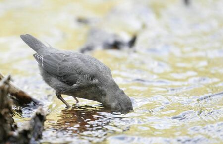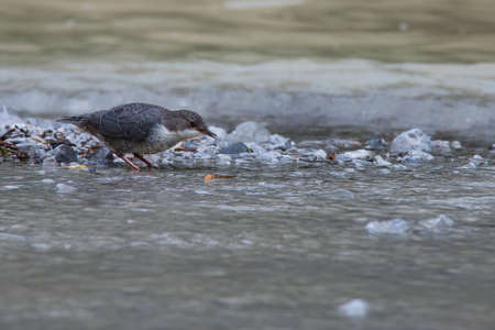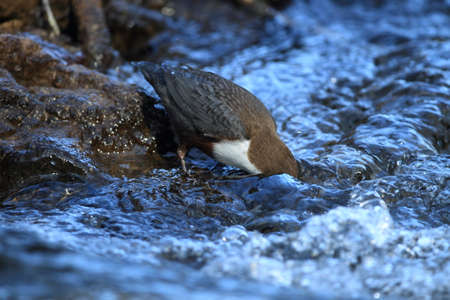 Close-up of a Northern white-throated dipper, Cinclus cinclus cinclus, foraging in water