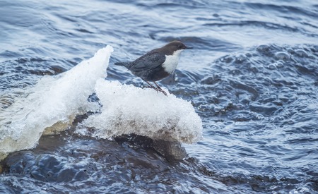 The white throated dipper Cinclus cinclus sitting on a stone and looking for food in winter, the best photo.