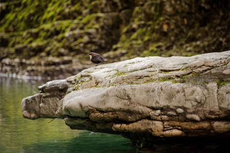 Cute little bird sitting on the stone against the background of rock and clear green river