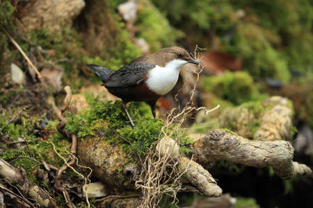 Dipper, Cinclus cinclus, single bird with nest material, Wales
