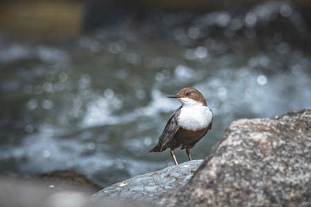 White-throated dipper (Cinclus cinclus) sitting on a stone. Diving bird hunting in the water. spring moment from the mountain river