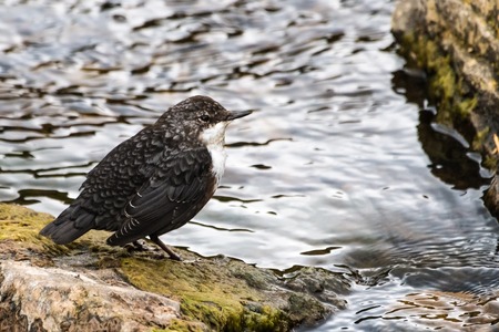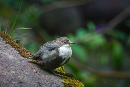 Young white-throated dipper on a rock in the mountain river