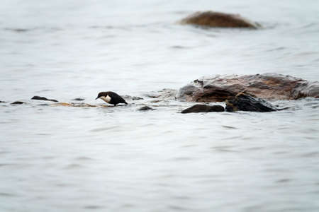 White-throated dipper (Cinclus cinclus) on the North river. Typical representative of a river ecosystem (mountain and Northern watercourses). Series of images shows bird hunting for fish fry
