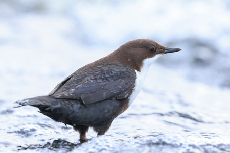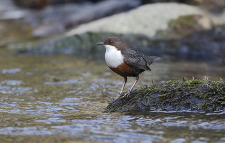 White throated dipper standing in water in its habitat