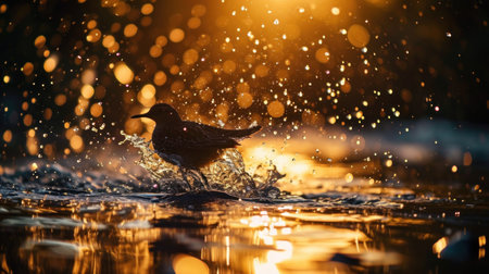 Bird splashing in the water at night with sun rays and bokeh