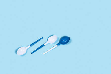 So beautiful and so dangerous plastic spoons. Environmental problem of plastic rubbish pollution. Flat lay, top view, copy space.