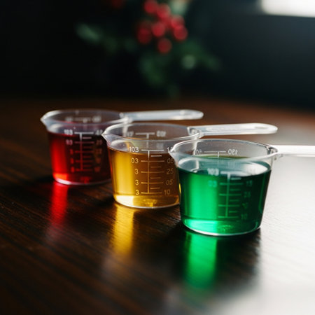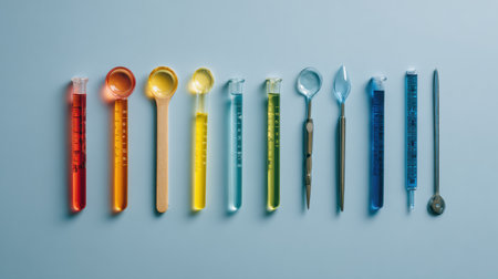 Various laboratory measuring instruments in vibrant colors are lined up on a light blue surface, showing their different shapes and sizes for scientific use.