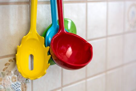 Colorful ladles hanging on a wall in the kitchen