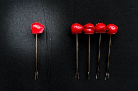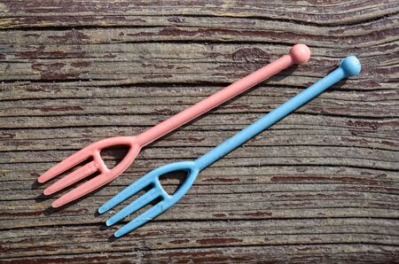 Closeup of two small plastic forks on wooden background