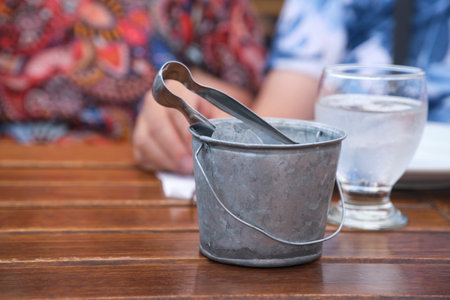 Metal bucket with ice cubes and tongs on a table in the foreground, in the background a glass of cool water and an unrecognizable couple out of focus. Detail of an outdoor summer meal.