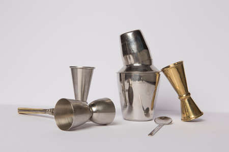 Flat lay composition with bartender iron tools, such as cocktail shaker, jigger, mixing glass, stirring spoon. Background is white.