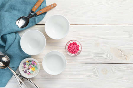 Culinary background with a set of empty dishes for dessert, ice cream. Top view, copy space.